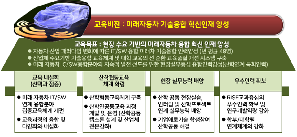 『인천대학교 미래자동차 기술융합 혁신인재양성 사업단』은 자동차의 패러다임 변화에 따른 미래자동차에서 요구되는 IT/SW와의 융합기술 분야를 특화 분야로 선정하고 스마트카와 친환경차 2개의 트랙을 중심으로 선택과 집중을 통한 내실이 있는 전문교육 구성과 이를 기반으로 실제 실무역량을 강화할 수 있는 산학협동 교육체계 및 인력양성을 수행하는 일체화된 시스템을 가지고 추진하고자 함.